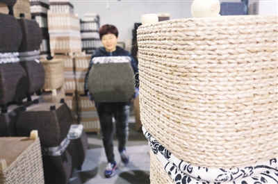 在山東省博興縣錦秋街道灣頭村,一名村民在搬運草柳編工藝品。目前,在這個有1800多戶村民居住的村莊,900多戶開起了淘寶網(wǎng)店。陳彬 攝 新華社發(fā)