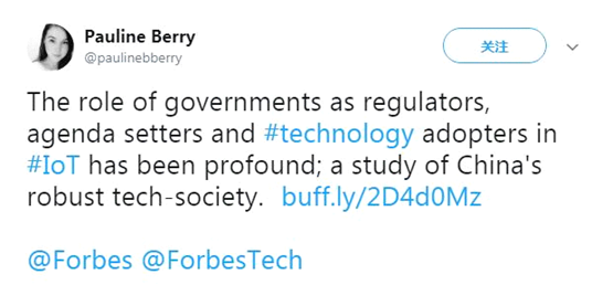認(rèn)證為數(shù)據(jù)分析師的網(wǎng)友“Pauline Berry”評(píng)論稱:“研究中國(guó)充滿活力的科技社會(huì)可以得出一個(gè)結(jié)論——政府在物聯(lián)網(wǎng)領(lǐng)域作為規(guī)則制定者、議程設(shè)定者和技術(shù)采納者的角色是意義深遠(yuǎn)的。”